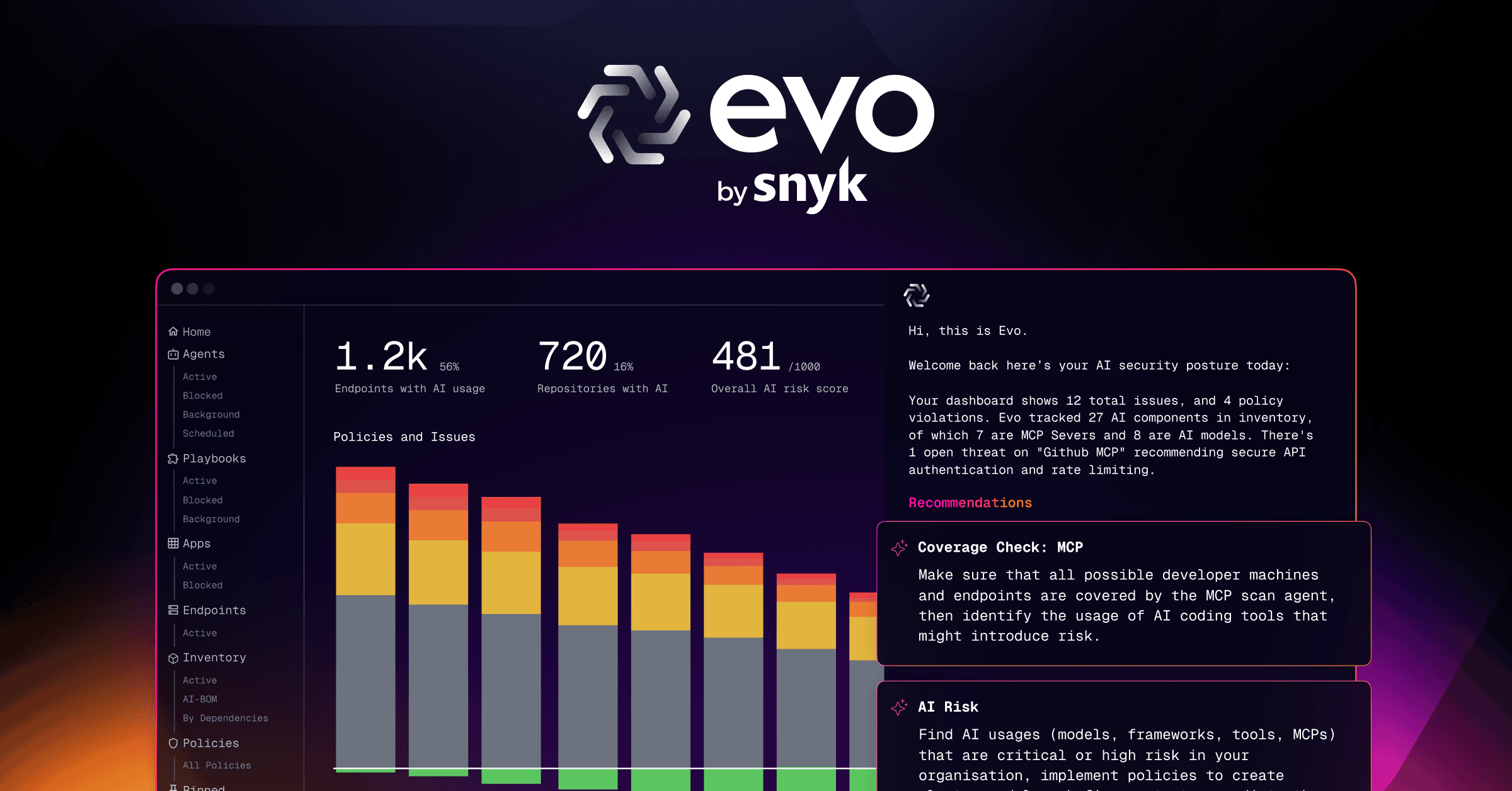 Evo by Snyk is an agentic security orchestration system for AI security engineers that provides the broadest range of protection from new threats against AI apps and agents across the AI SDLC.